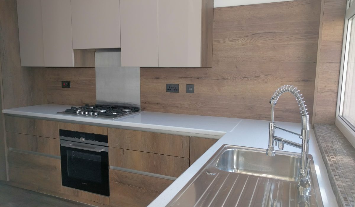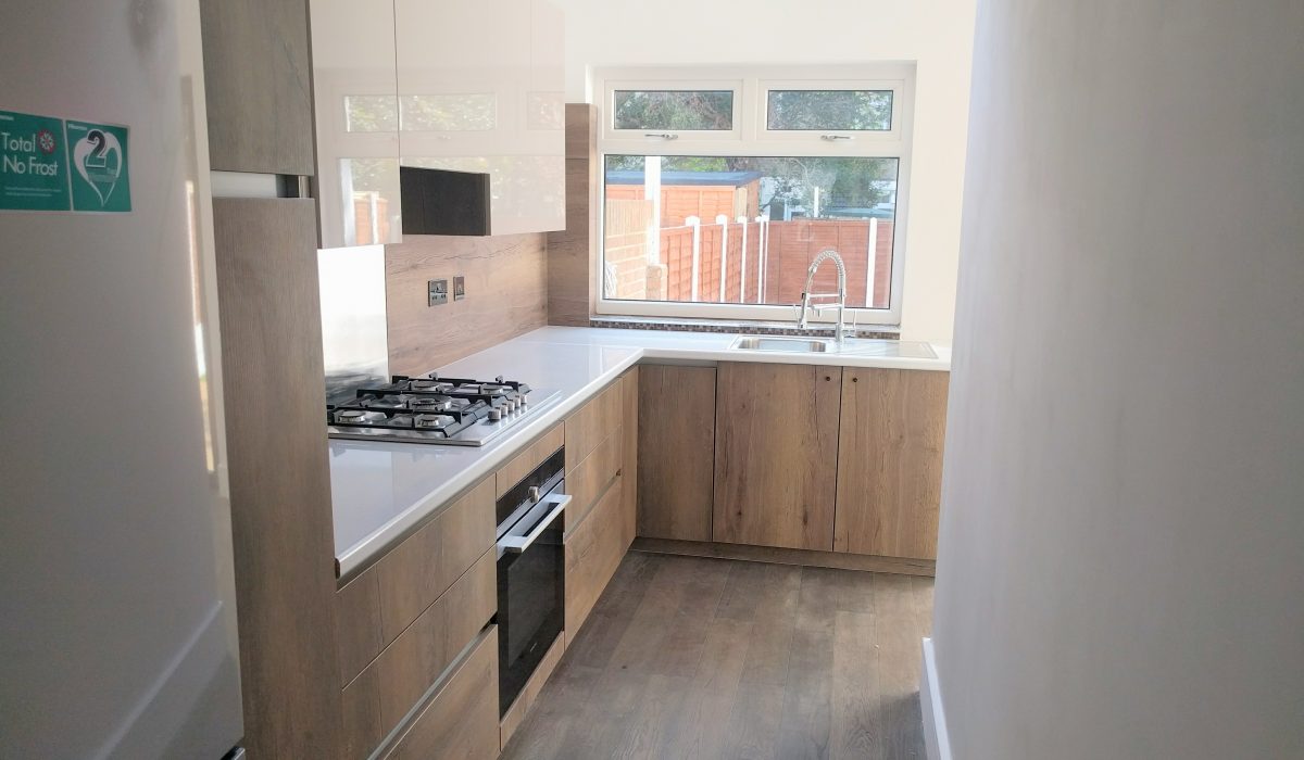 Contemporary style kitchen in tobacco oak base units with creamy gloss wall cabinet doors