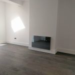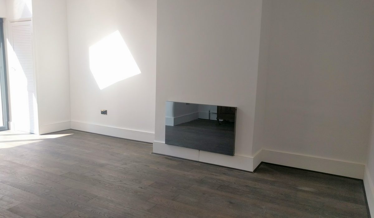 Radiator, Modern electrical fireplace, Fitted Vito semi flush ceiling light in polished chrome and 5 glass shades, real dark wood oak engineered flooring.