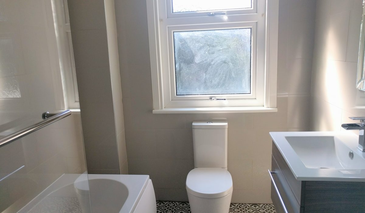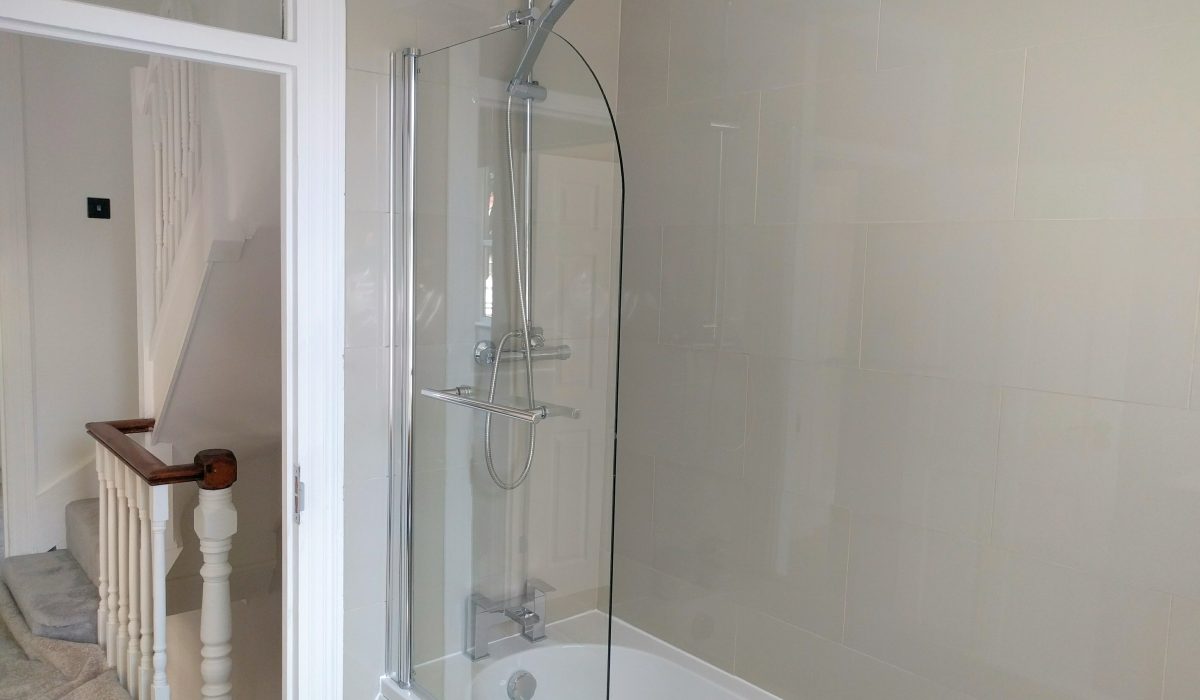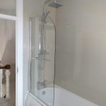 Panelled bath with fitted glass shower screen. Two modern shower attachments with waterfall bath mixer tap