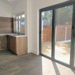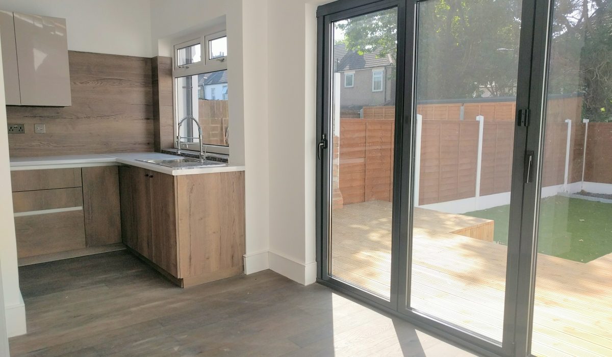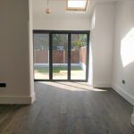 Double glazed graphite grey by-folding doors, wood flooring, skylight window
