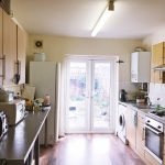 Laminate flooring throughout, range of base and eye level wall units, laminate wood work surface, part tiled splashback, integrated electric hob and oven, stainless steel sink with mixer tap, space for washing machine and fridge/ freezer, various power points, light fittings, double-glazed doors leading to private rear paved garden.