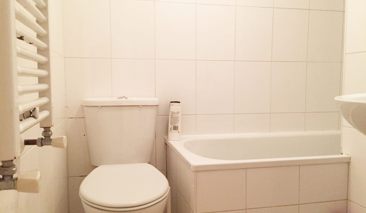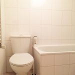 L-shaped bathroom, tiled flooring throughout, low level flush W/C, bath unit with shower attachment, wash hand basin with mixer tap, tiled walls throughout, heated towel rail light fitting, extractor fan.