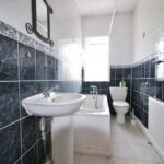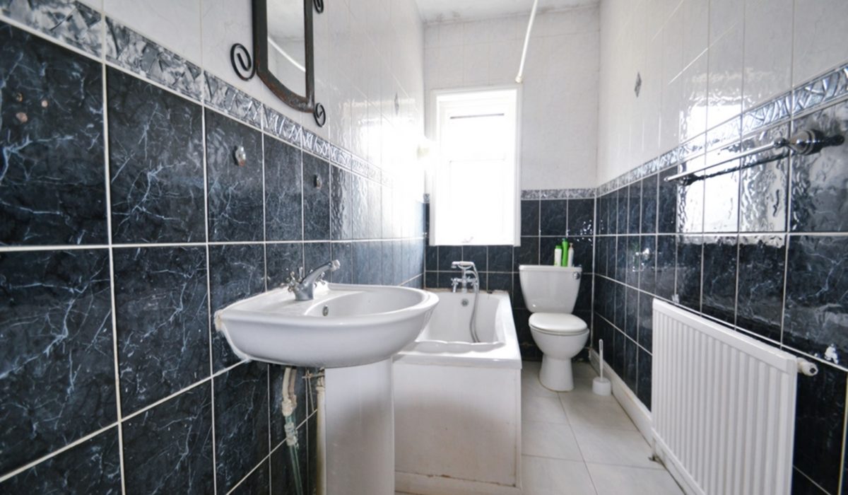 Tiled walls and flooring throughout, bath unit with shower attachment, wash hand basin on pedestal with mixer tap, low level flush WC, radiator, light fitting, high ceilings, rear aspect double glazed window.