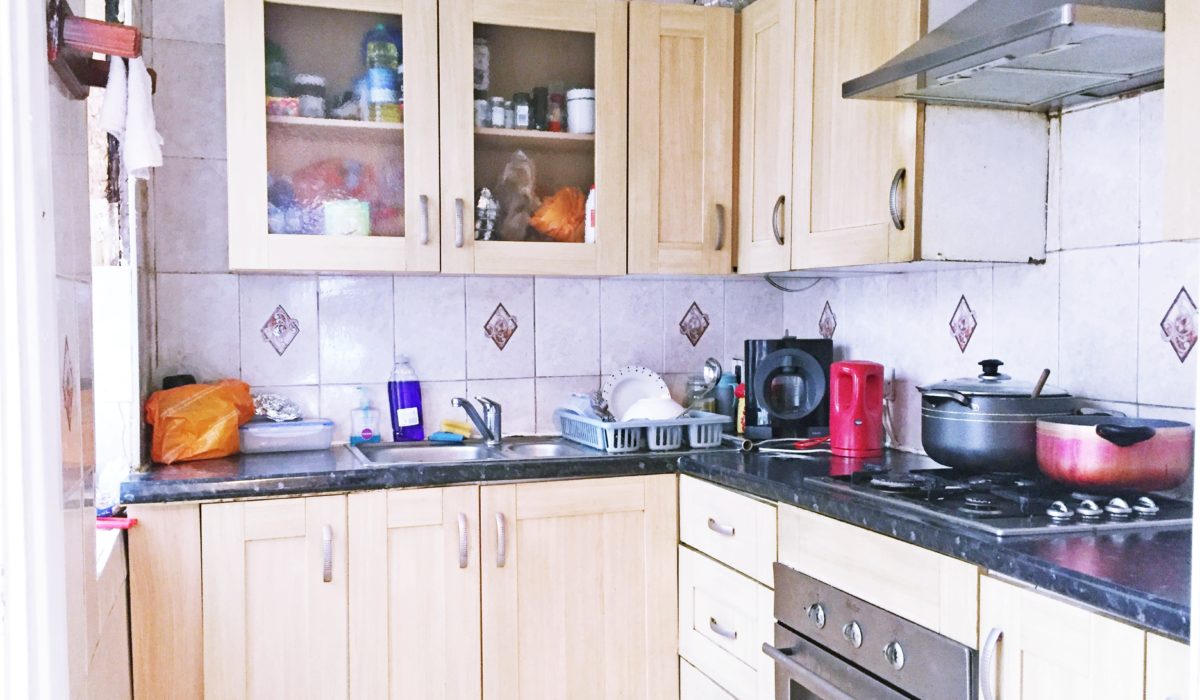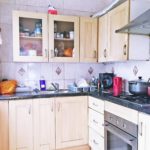 Tiled flooring throughout, range of base and wall units, laminate wood work surface, stainless steel sink with mixer tap, part tiled walls, integrated gas hob, electric oven and extractor fan, various power points, light fittings, side aspect single glazed window.