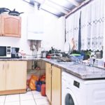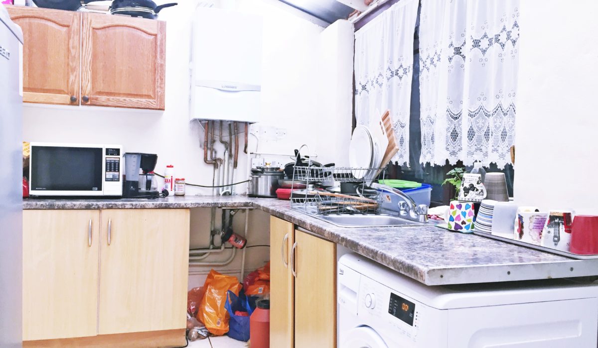 Tiled flooring throughout, range of base and wall units, laminate wood work surface, stainless steel sink with mixer tap, space for washing machine and fridge/ freezer, rear aspect single glazed window.