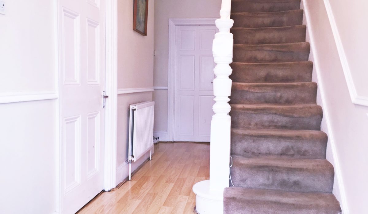 Tiled flooring throughout, light fitting, double glazed front door leading to entrance door.