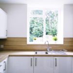 Wood laminate effect work top, range of eye level and base units, white gloss finish, integrated appliance, mixer taps, four ring Neff gas hob, double Neff electric oven, window to rear, concreted style floor tile, halogen spotlights, various power points.