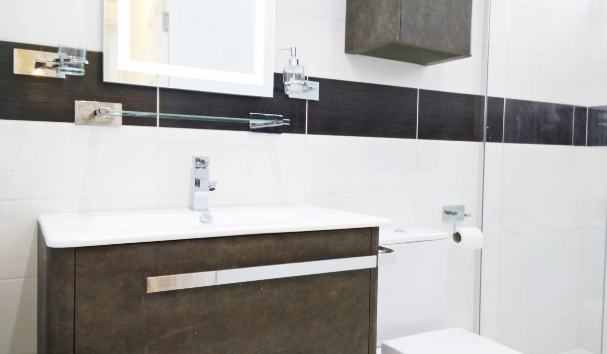 Fully tiled, double shower with sliding door, large sink, walnut linen effect, shaver point, towel rail, music operated mirror with bluetooth and light, luxury finishing throughout, laundry boxes under sink, lower level flush, soft closure toilet seat, halogen spot lights.