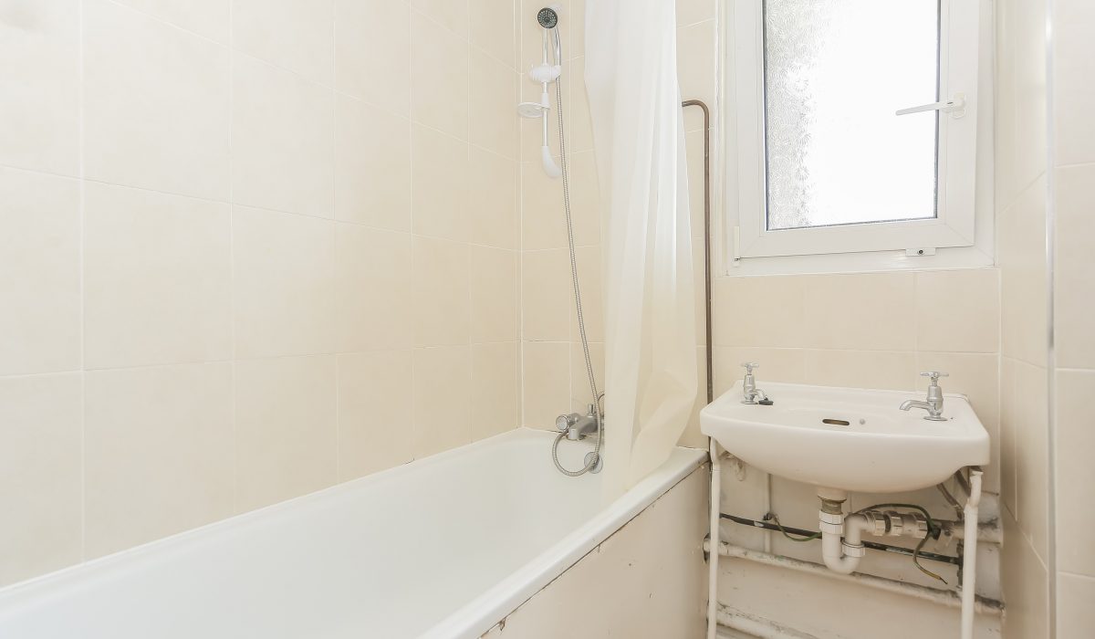 Front aspect, bath with shower head, hot/cold mixer tap, basin with separate hot/cold taps.