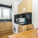 Gas cooker with extractor fan. Various eye and low level units. Space for washing machine . Laminate floor with partially tiled walls. Chrome mixer tap sink, various power sockets. Large enough to dine in.
