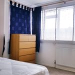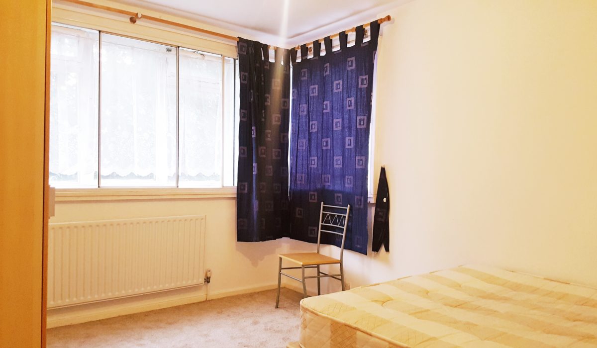 Dual aspect windows, carpeted throughout, radiator, double bed, wardrobe, chest of drawers. Neutral decor.