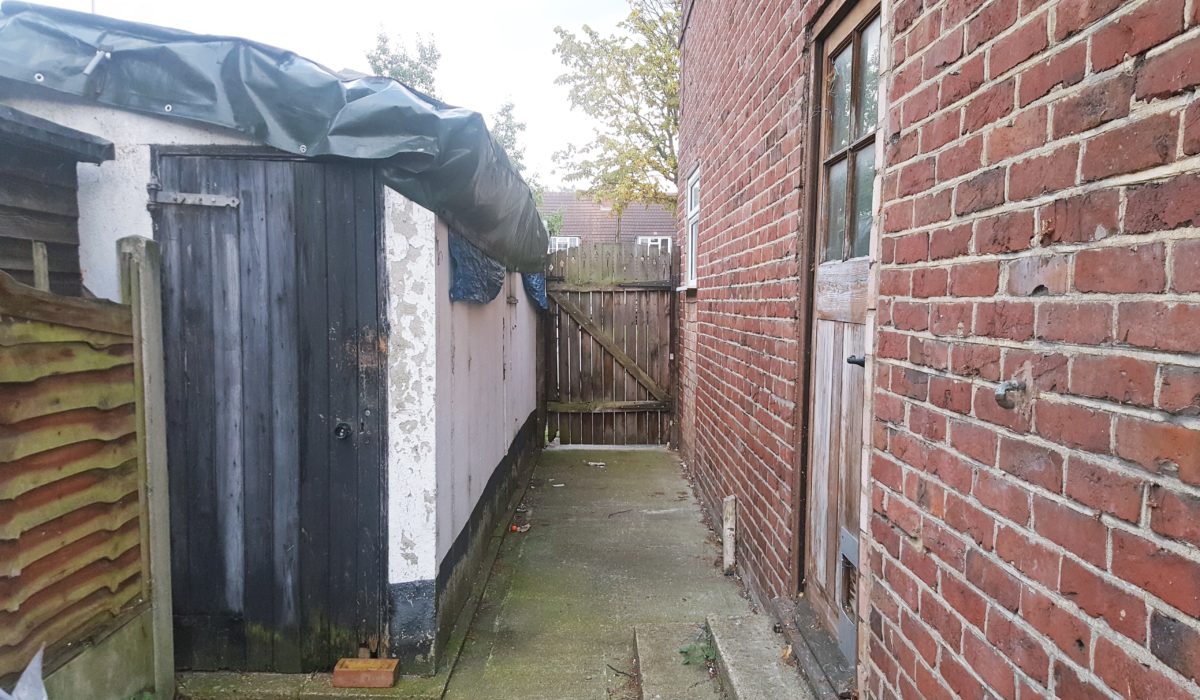 Part concrete, mostly lawned, wooden shed, wooden fencing surround. Access from side and garage.