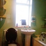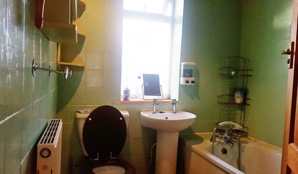 Tiled walls, bath unit with shower attachment and mixer taps, wash hand basin with separate taps, low level flush WC, radiator , rear aspect double glazed window.