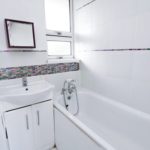 Sink with mixer taps with storage and eye level mirror. Bath with mixer tap and shower head, tiled floor, tiled walls to bath. Double glazed window.