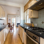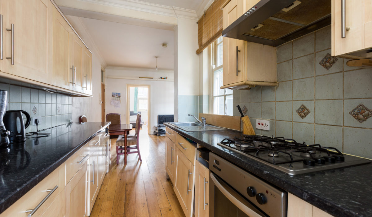 Range of eye level wall and base units, wood flooring throughout, part tiled walls, built in hob and oven, extractor fan, original sash window, stainless steel sink with mixer tap, various power points.