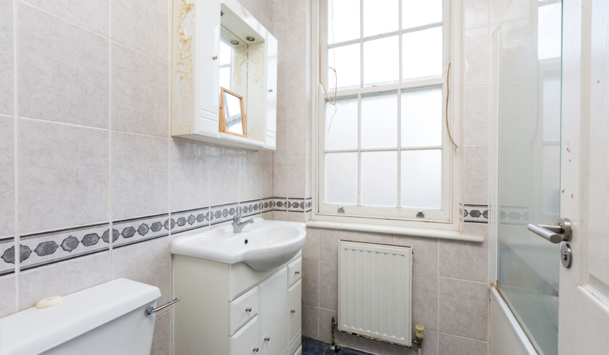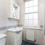 3 piece bathroom suite fully tiled, wash hand basin with storage cupboard, low level flush radiator, large sash windows to rear.