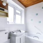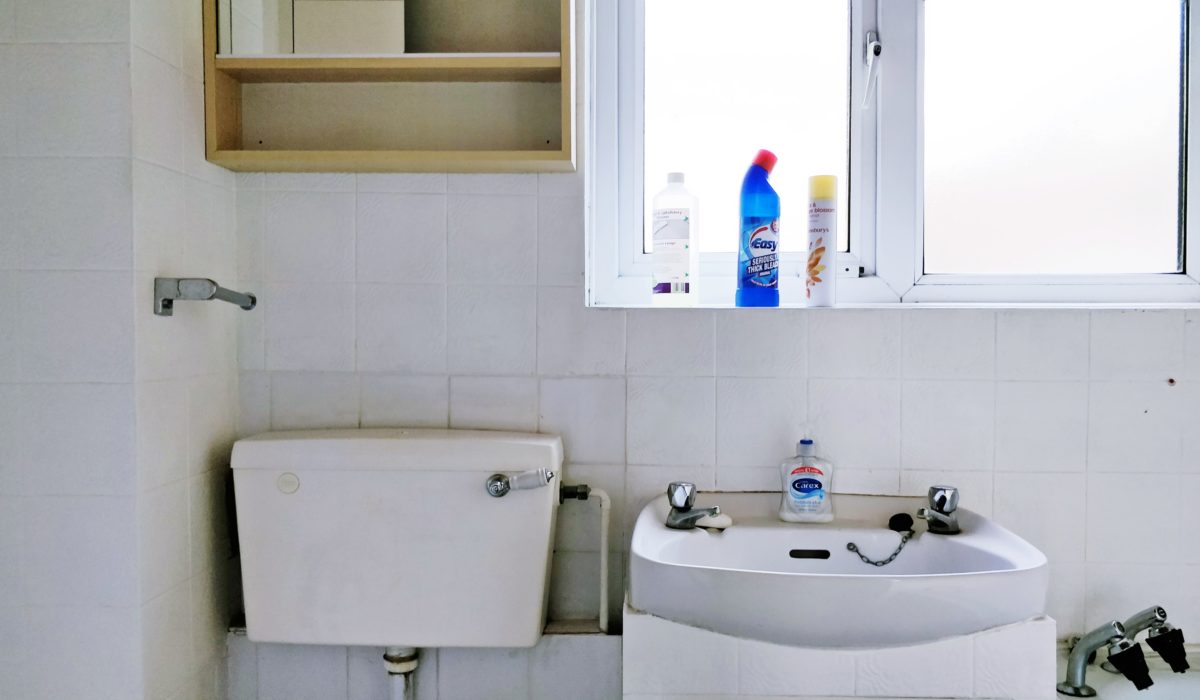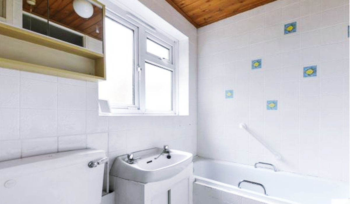 Tiled flooring throughout, tiled walls, bath unit with separate taps, low level flush, wash hand basin with separate tap, under sink storage, double glazed frosted windows.