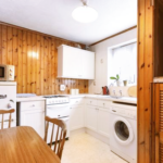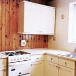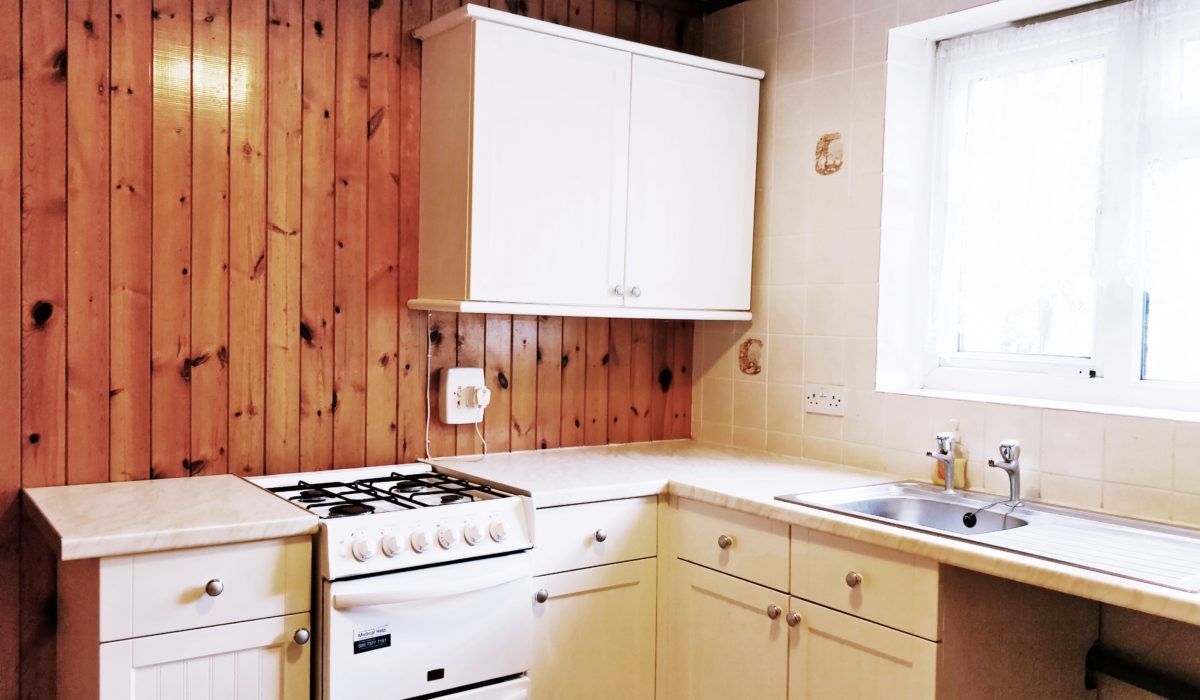 Tiled flooring throughout, range of base and wall units, laminate wood work surface, sink with separate taps, standing gas cooker / oven, space for washing machine, various power points, light fitting, double glazed glazed window, built in storage cupboard.