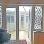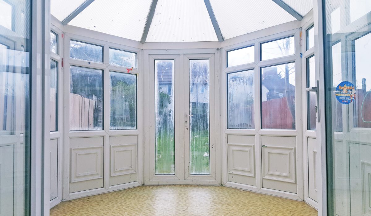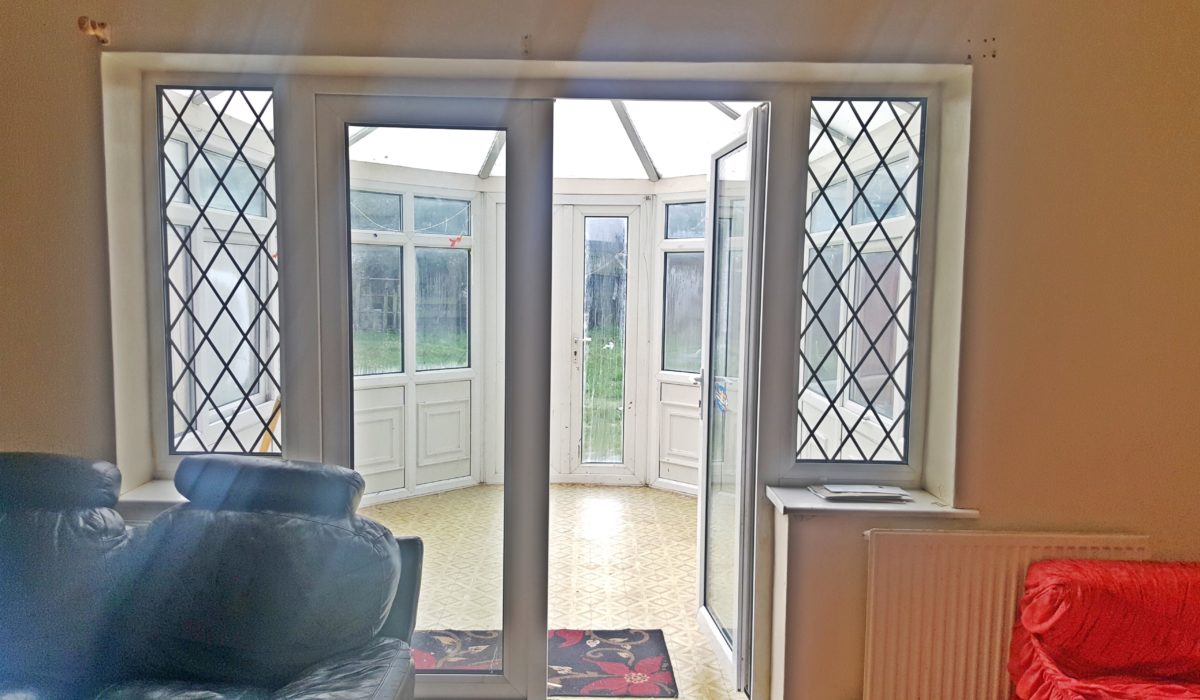 Lino flooring, double glazed windows and doors leading out to the garden, frosted roof panels, fan light fitting.