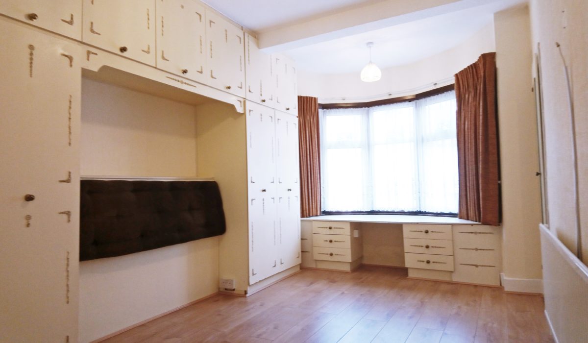 Laminate throughout, range of fitted wardrobes and chest of drawer, built in headboard, various power points, light fittings, radiator, front aspect double glazed bay window, built in storage cupboard.