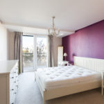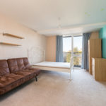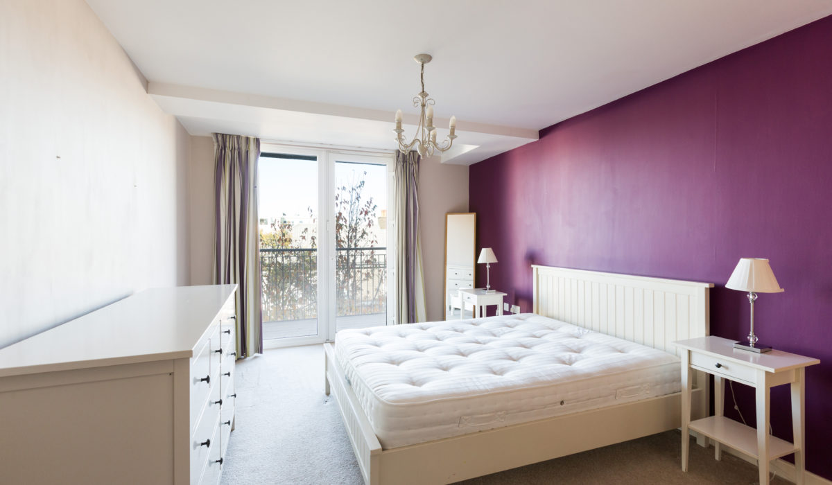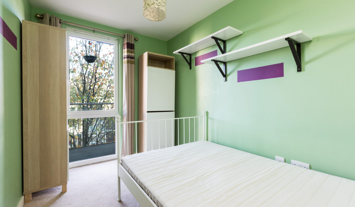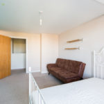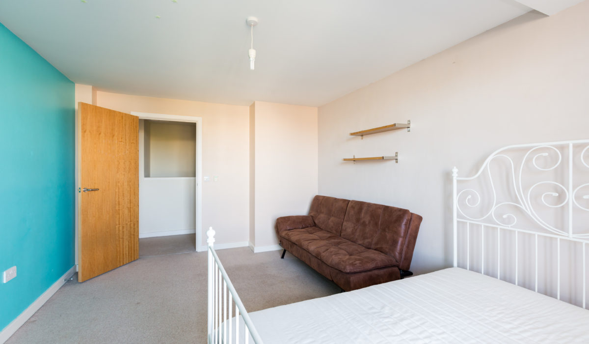 Carpeted throughout, built-in cupboard, double glazed floor to ceiling doors leading out to a full length decked balcony, various power points, light fitting.