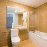Tiled flooring throughout, fully tiled walls, low-level flush WC, bath unit with shower shield and attachment, wash hand basin with mixer tap, mirror with light, towel radiator, light fitting.