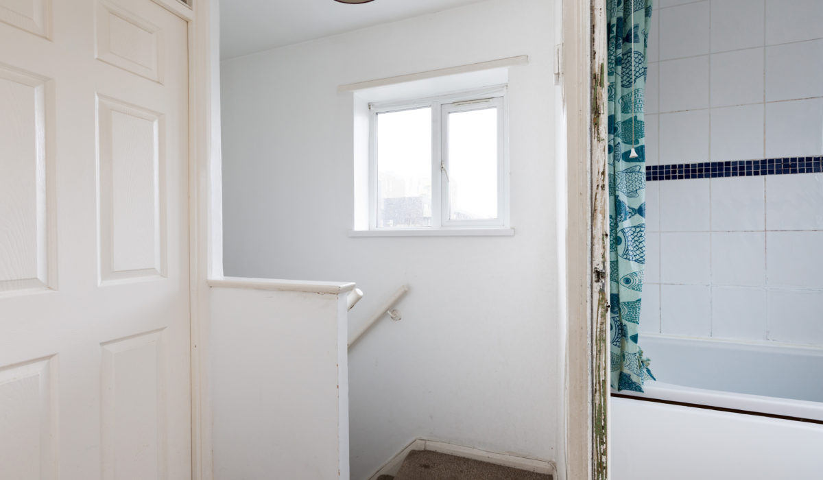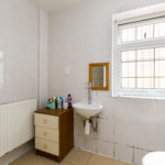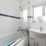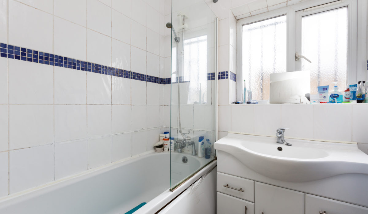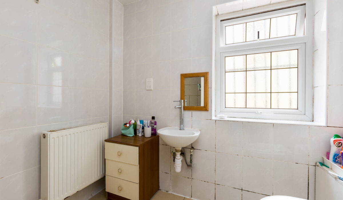 Fully tiled floor and walls, bath with mixer taps and shower attachment, glass shield , wash basin , mixer tap with under sink storage, obscured double glazed windows.