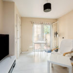 White laminate flooring throughout, neutral decor, double glazing lead window and door leading out onto paved garden area, light fittings, various power socket.