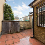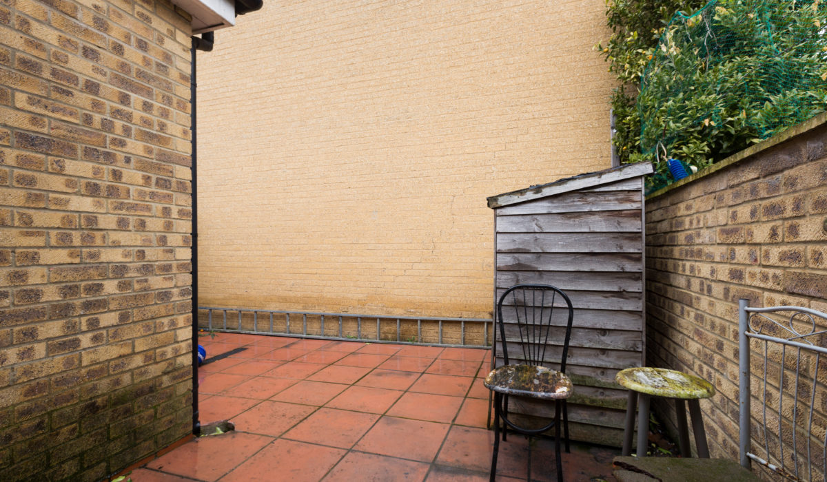 Fully paved, wooden shed, brick wall surround, security grille and gate to windows and doors.