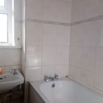 Tiled flooring and walls throughout, bath unit with shower attachment, wash hand basin with separate taps, light fitting.