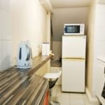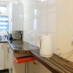 Tiled floor and walls, base unit, laminate work surface, stainless steel sink with mixer tap, gas cooker & oven, extractor hood, fridge freezer, microwave, washing machine, breakfast bar, light fittings