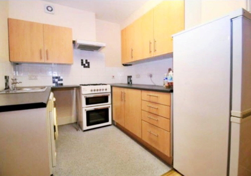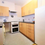 Lino flooring throughout, range of base and eye-level wall units, laminate wood work surface, stainless steel sink with separate tap, part tiled splashback, washing machine, fridge/ freezer, extractor hood,gas cooker, various power points.