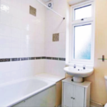 Tiled flooring and part tiled walls, bath unit with shower attachment, wash hand basin with separate tap and under sink storage, low level flush WC, extractor fan, double glazed frosted window.