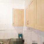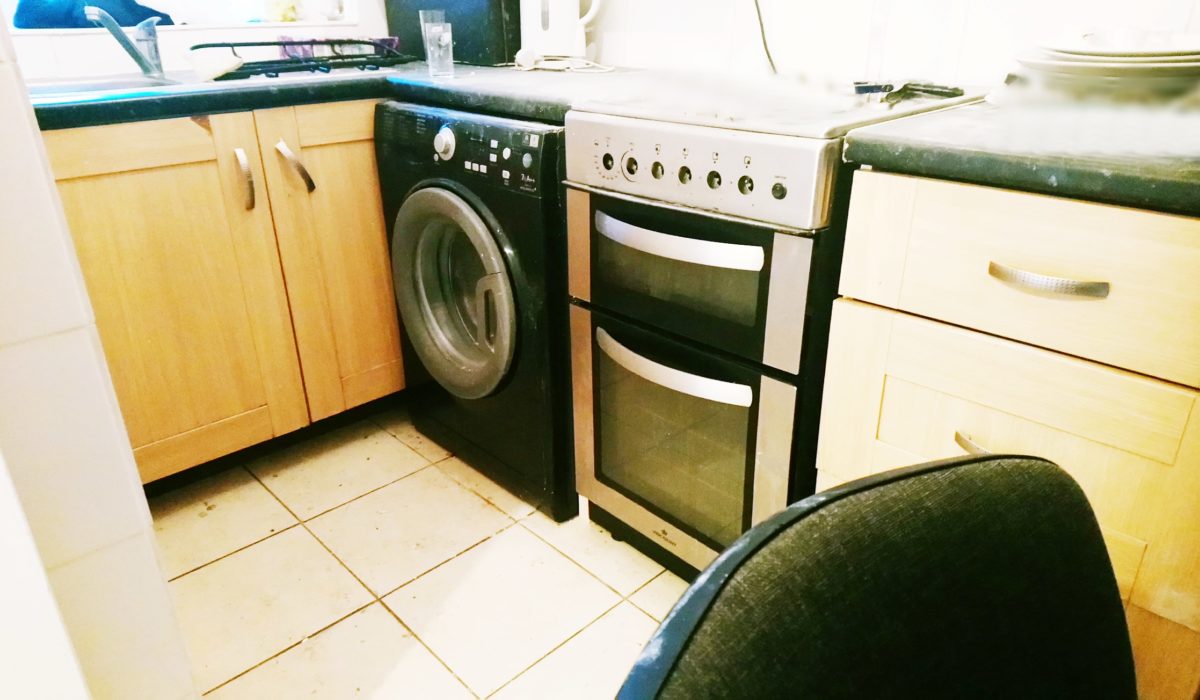 Tiled throughout, range of base and wall units, laminate wood work surface, stainless steel sink with mixer taps, freestanding gas cooker and extractor, washing machine, breakfast bar and stools, various power points, light fittings.