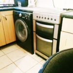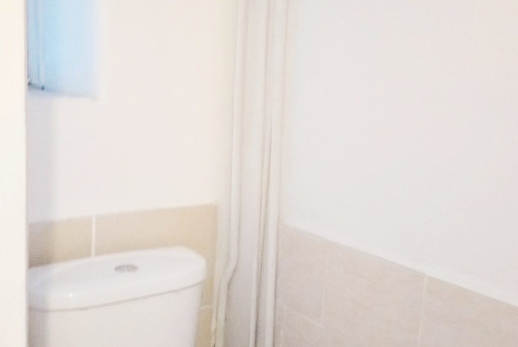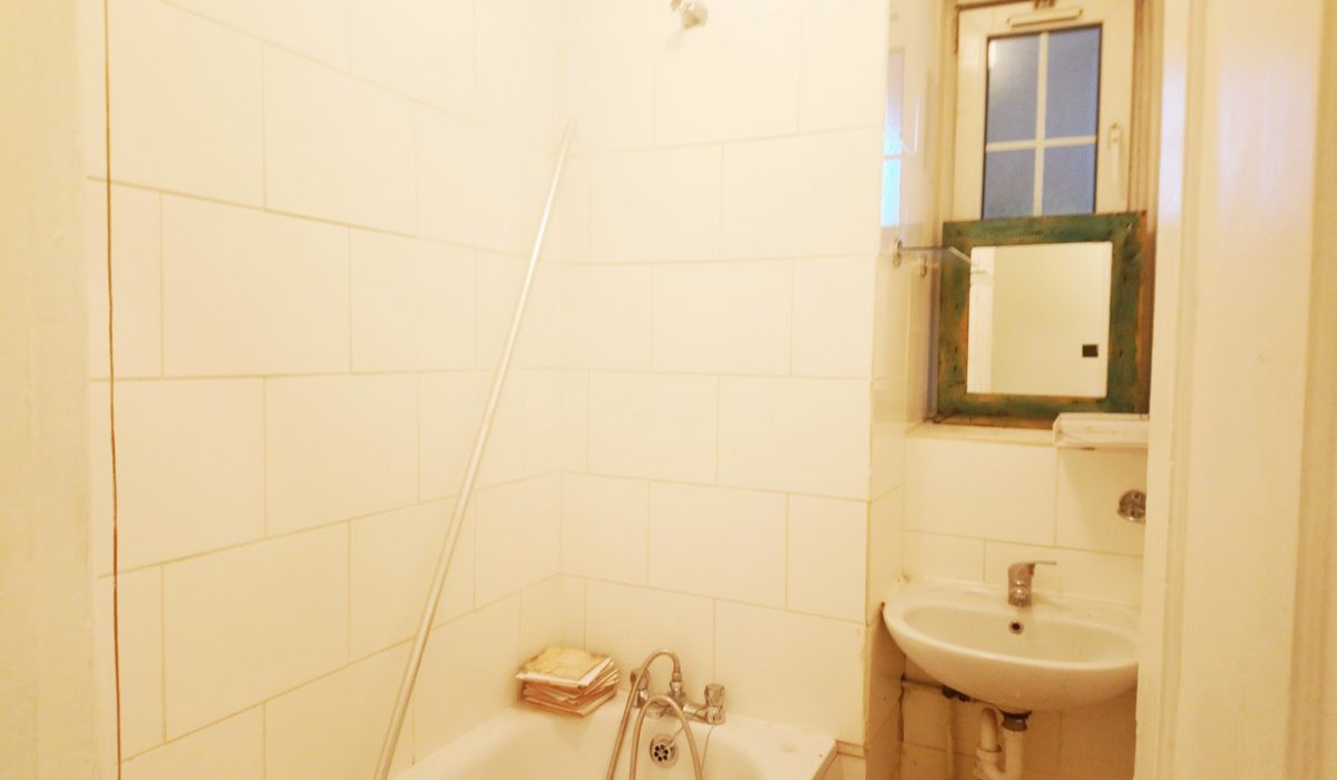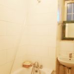 Two Piece Bath suite with shower attachment, wash basin with mixer tap, radiator.