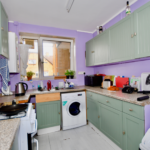 Double glazed window to front, laminate work surface, selection of base and wall mounted units, integrated cooker with gas hob, and electric oven. Stainless steel single sink, drainer unit, mixer tap, washing machine, space for freestanding fridge freezer, laminate flooring and gas central heating combination boiler.