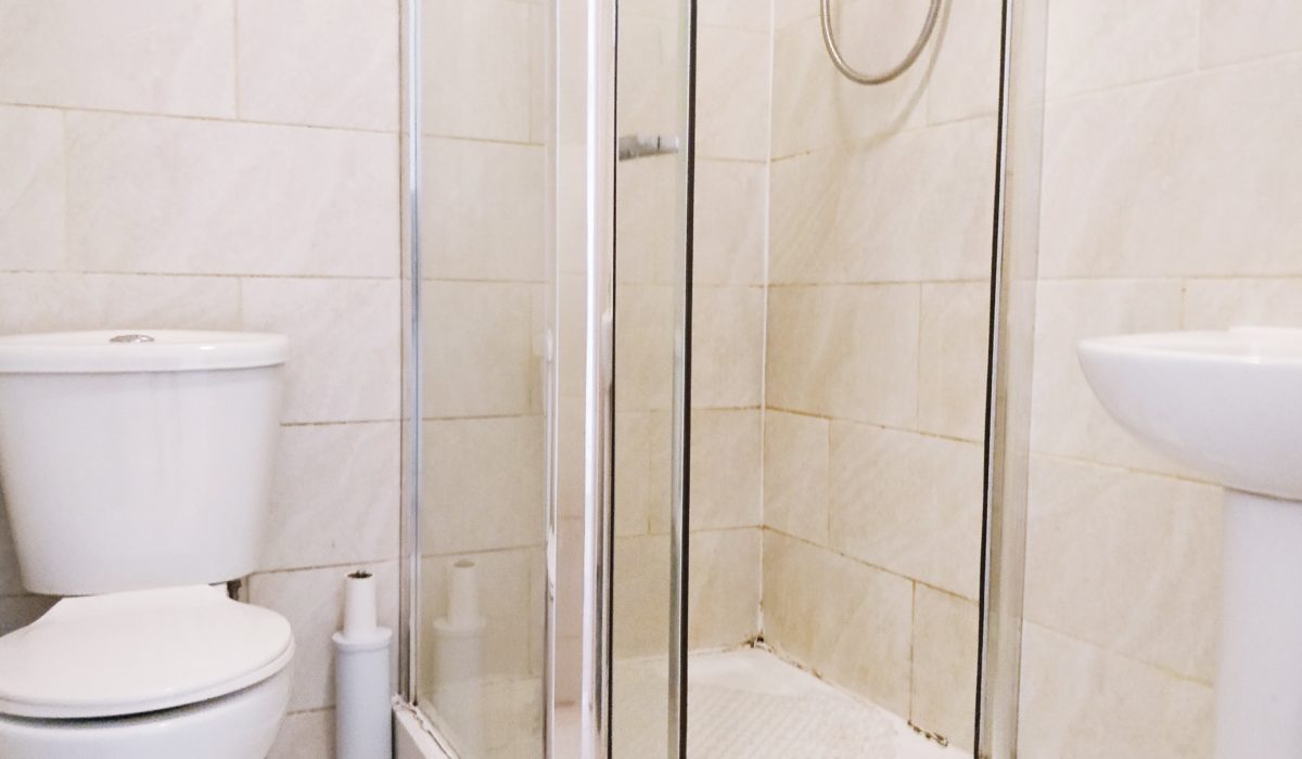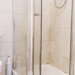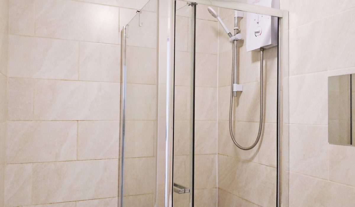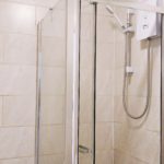 Fully tiled, wash hand basin with mixer tap, walk-in shower unit with electric shower attachment and low-level flush WC.