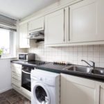 Range of base and eye-level wall units, fully tiled, mixer sink with drainer, electric hob and oven with extractor, various power points, double glazed windows to rear, washing machine and fridge freezer.