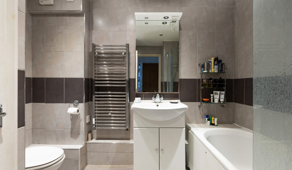 Three piece suite, fully tiled, power shower and screen, shaver points.
