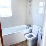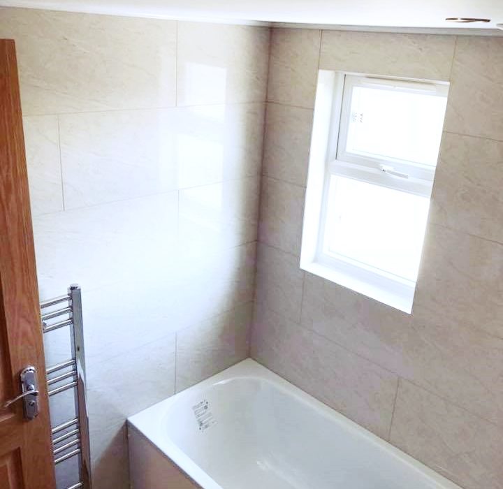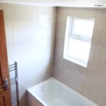 Tiled flooring throughout, tiled walls, bath with shower attachment, wash hand basin with mixer taps, low level flush WC, chrome heated towel rail, double glazed window, light fitting, extractor fan.