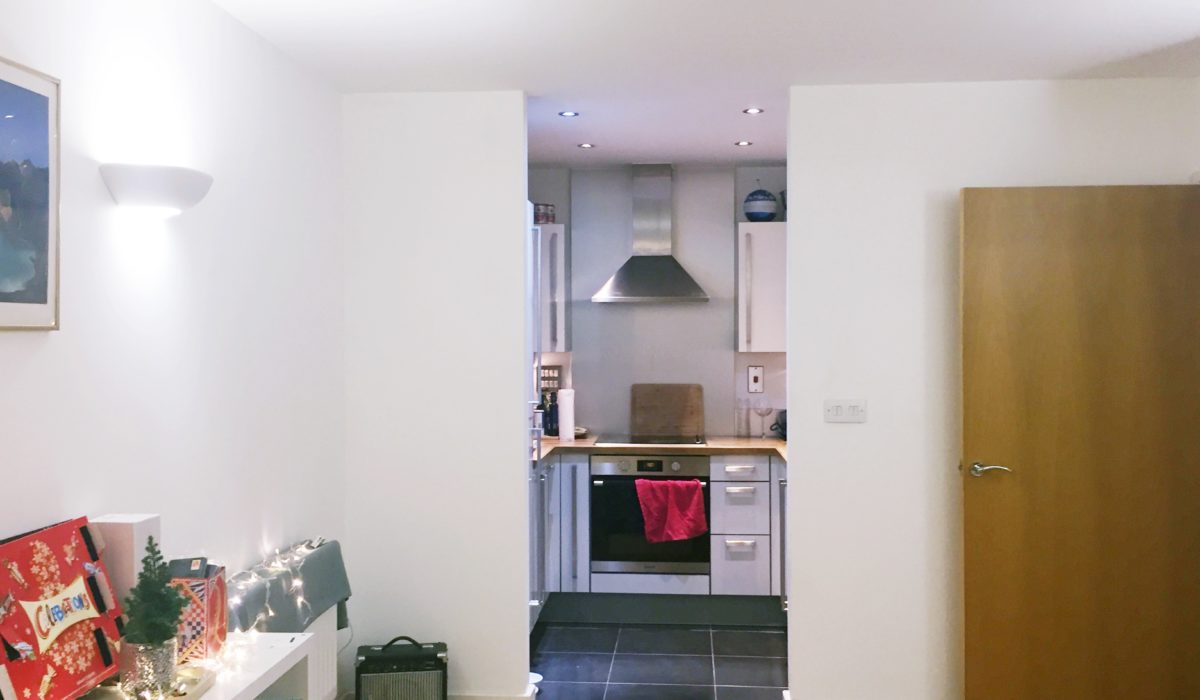 Base and eye level storage unit, built in gas hob with extractor, integrated dish washer, stainless steel sink with mixer taps, part tiled walls , laminate floor.