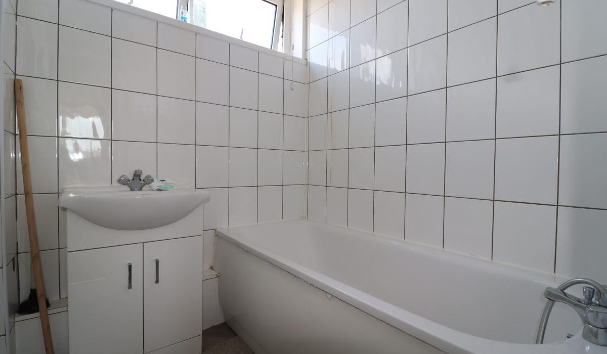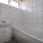 Fully tiled, bath unit with shower attachment, low level flush WC, wash hand basin on pedestal with mixer tap, powerpoint, light fitting, extractor fan, radiator, front aspect double glazed window.