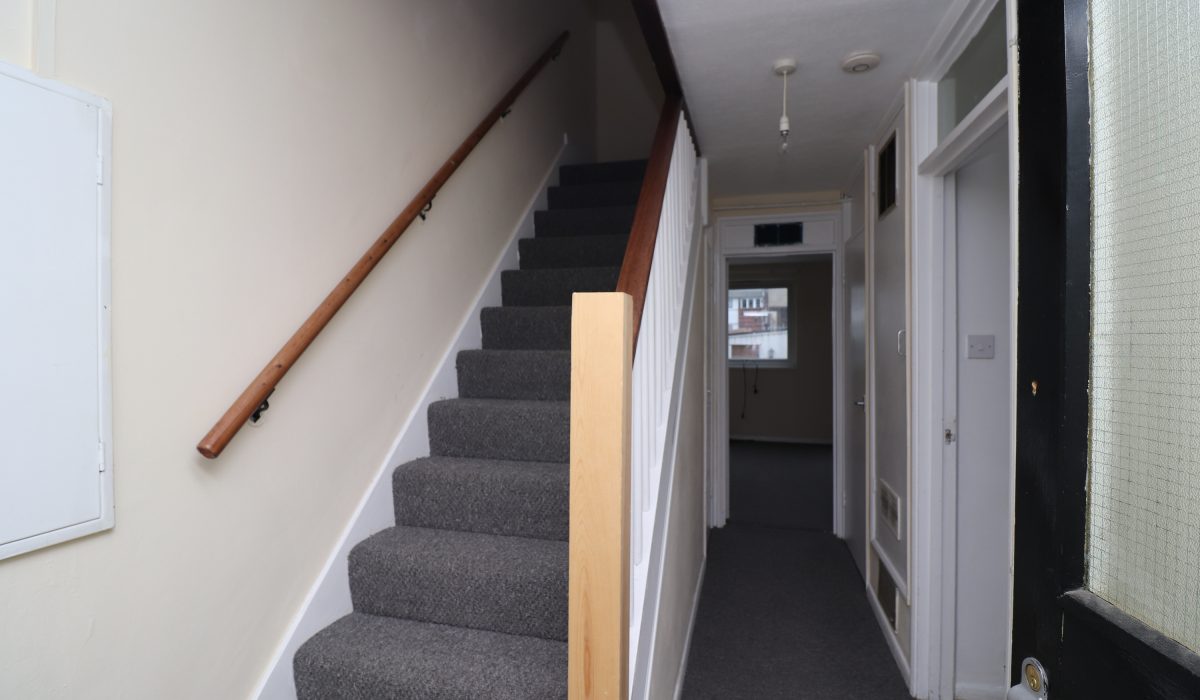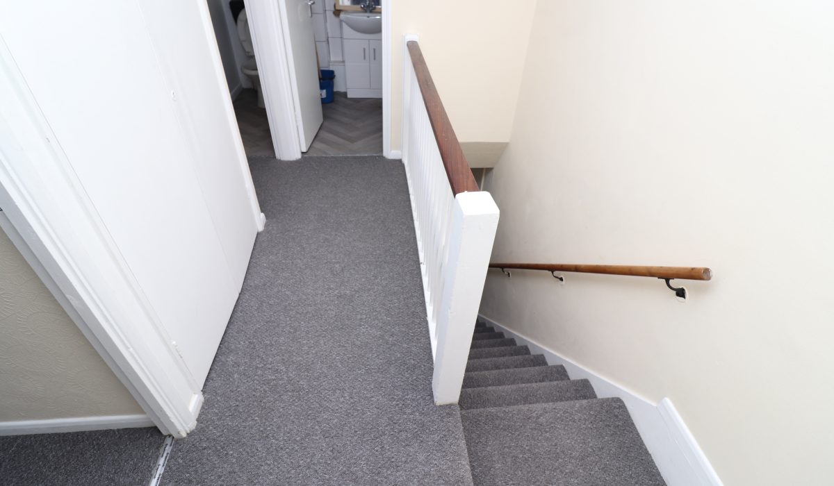 Carpeted flooring, stairs leading up to the first floor level of the property, access to kitchen, separate lounge, ample storage, radiator, power point, light fitting.