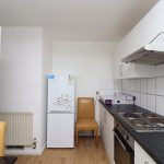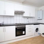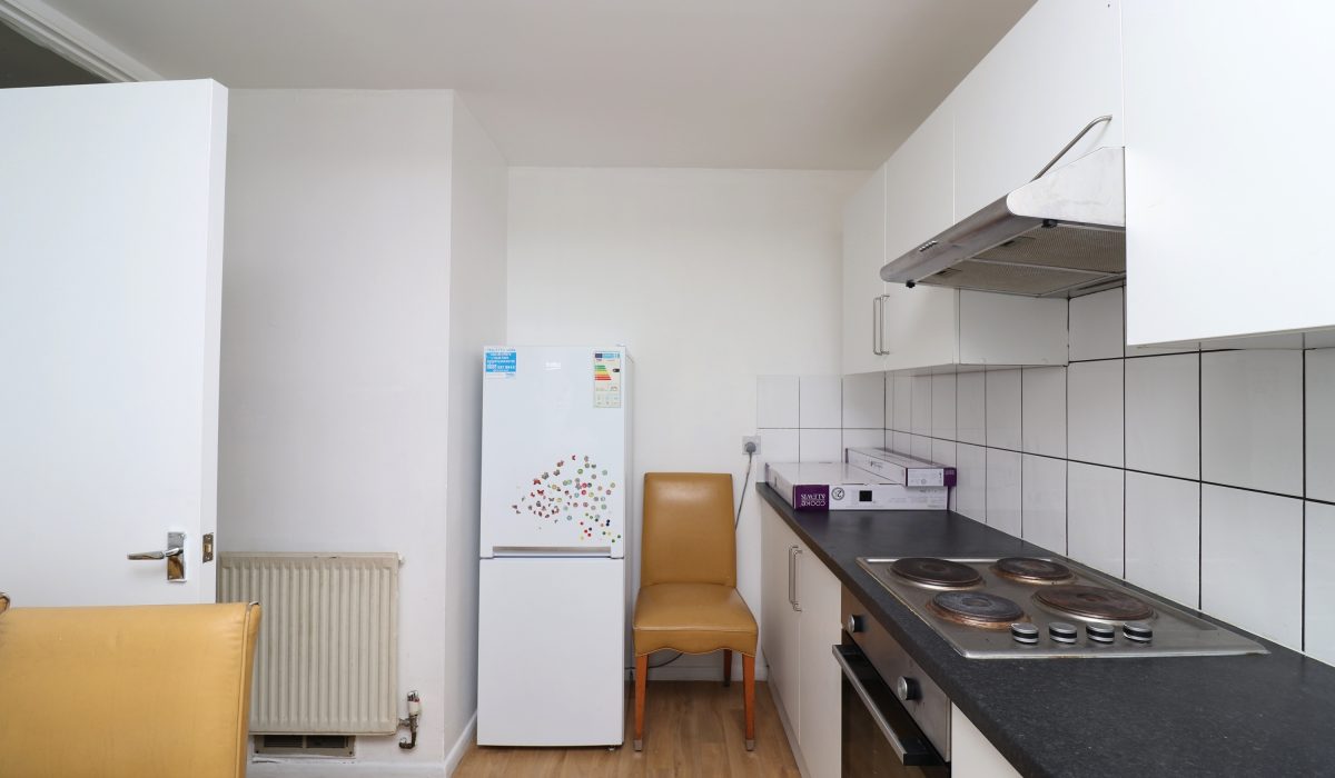 Range of base and wall units, laminate work surface, dining table, stainless steel sink with mixer tap, part tiled walls, integrated four burner stainless steel electric hob and oven with extractor hood, radiator, various power points, light fittings, front aspect double glazed window