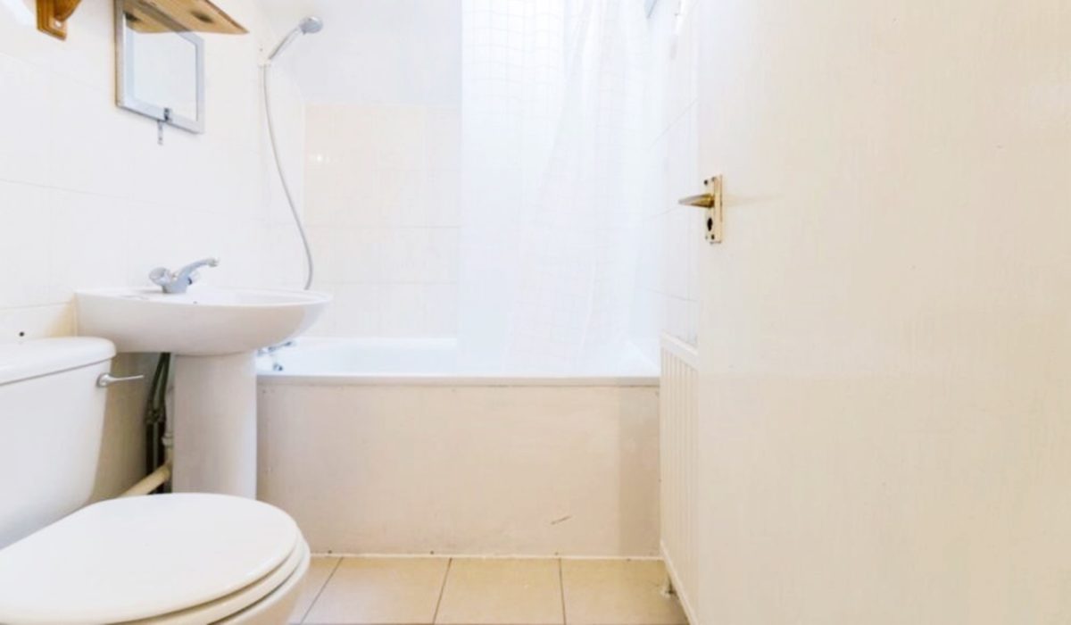 Fully tiled three piece family bathroom, bathtub with mixer taps and shower attachment, low-level flush WC, wash basin with mixer taps and extractor fan.