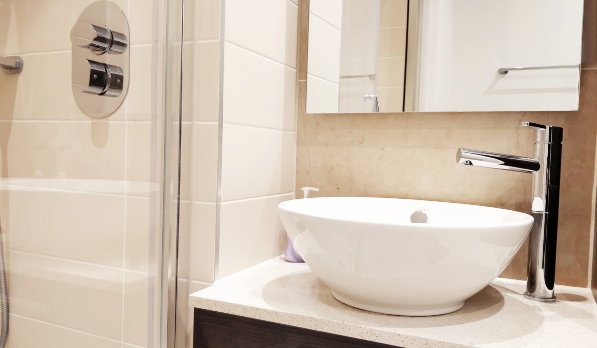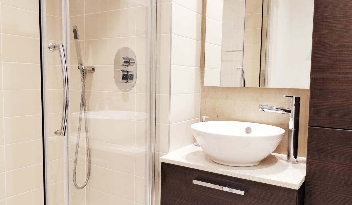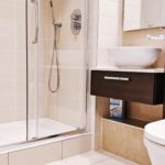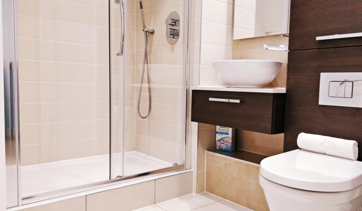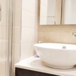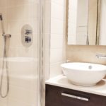 Fully tiled walls and flooring with underfloor heating, spacious enclosed walk in shower with chrome attachments, floating bowl style wash basin with chrome mixer tap and under storage, large mirror, floating WC with low level flush, built in storage cupboard.