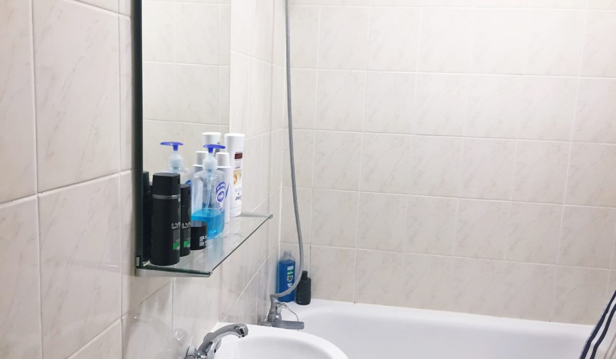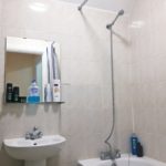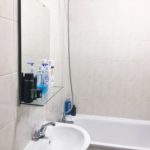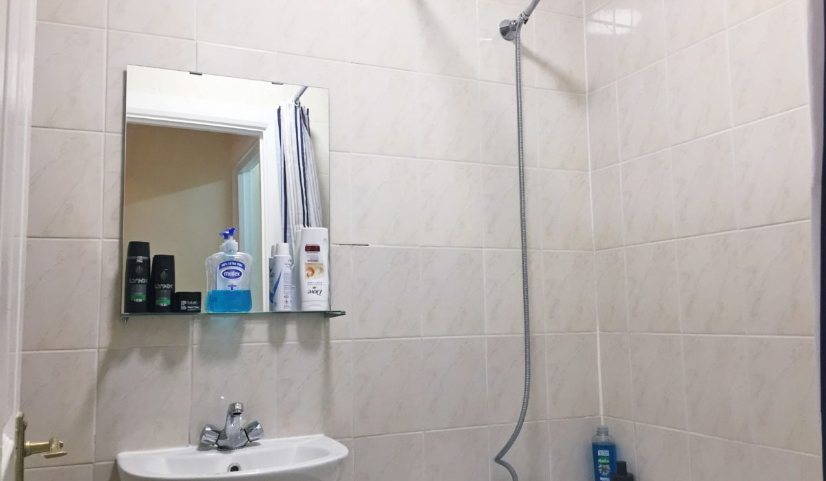 Modern 2 piece suite, vinyl flooring, fully tiled walls. Wash hand basin with mixer taps, bathtub with mixer taps, enclosed shower, radiator.