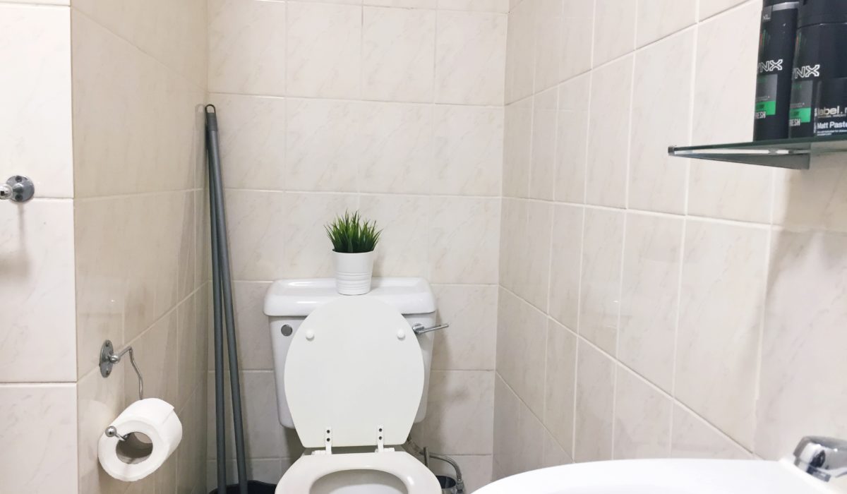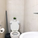 vinyl flooring, fully tiled walls, low-level flush WC, wash hand basin with mixer taps, radiator.