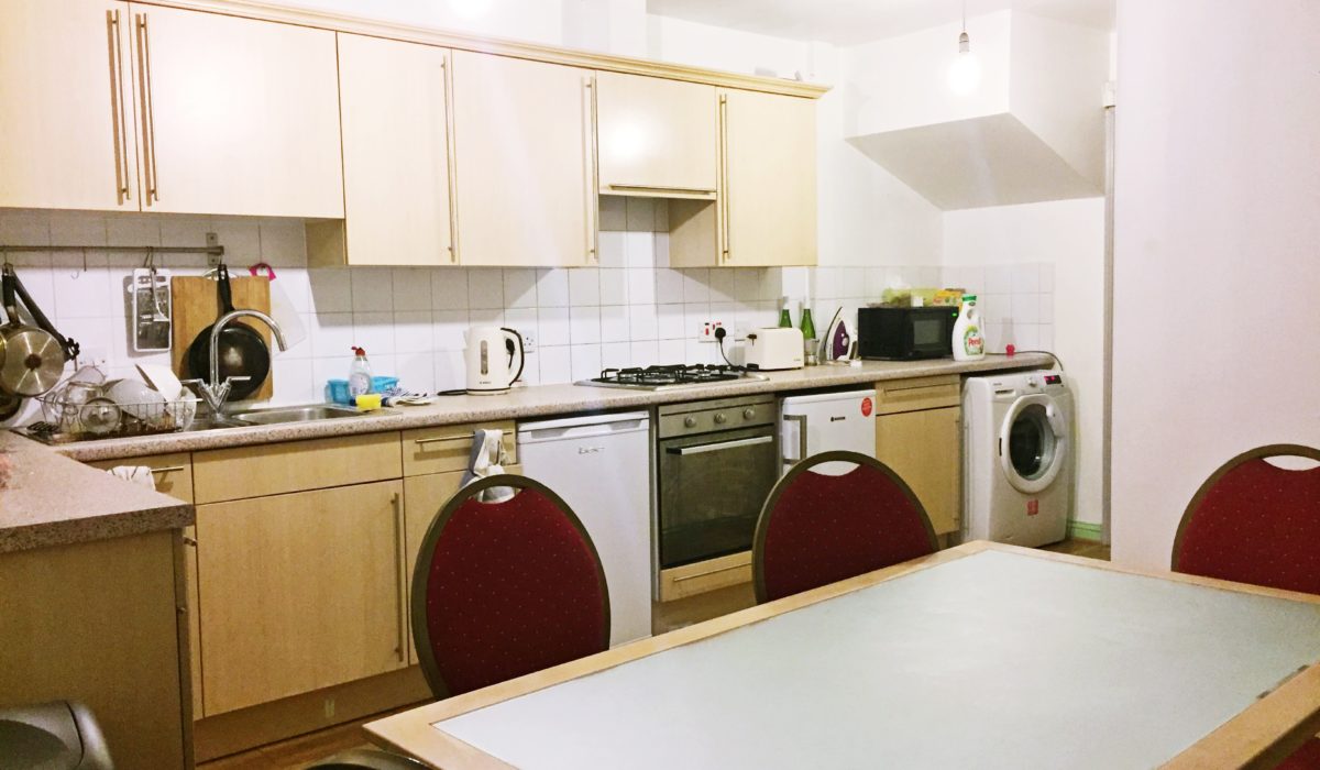 Shared open-plan kitchen / dining area. Fitted base and eye level unit, laminate worktop, gas cooker with extractor hood, part tiled walls, wood flooring, stainless steel sink with mixer tap, washing machine, fridge freezers, microwave, various power points. Dining table and chairs.