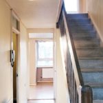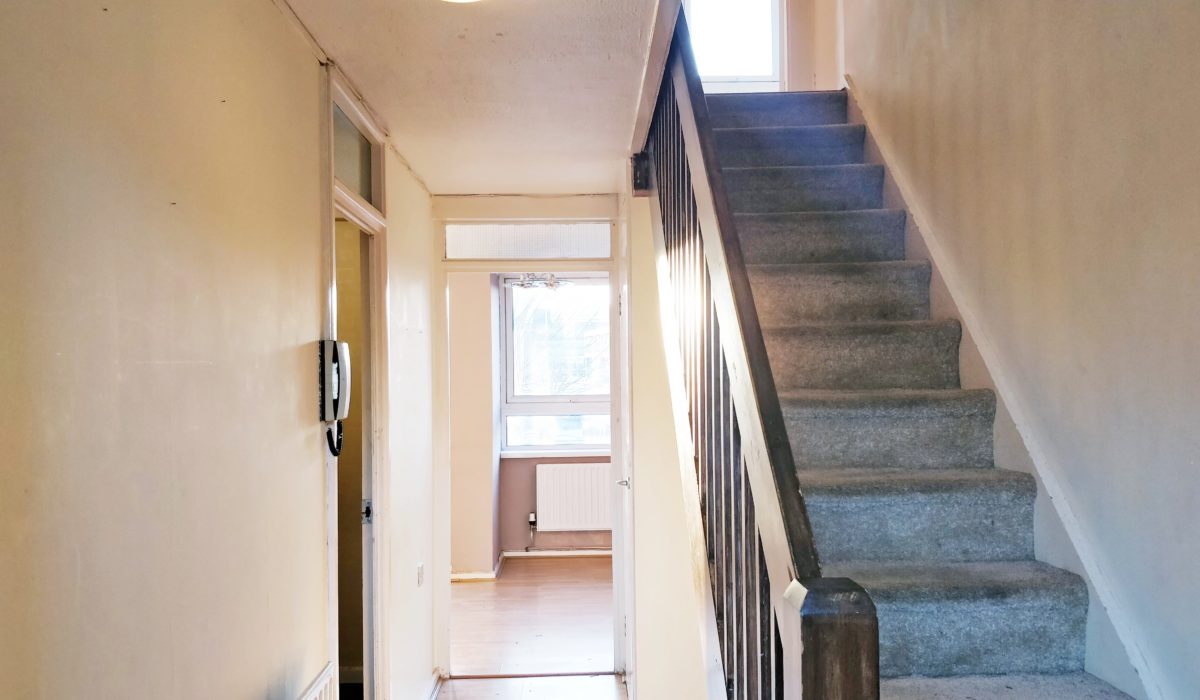 Laminate flooring, ample under stairs storage, stairs to top floor, radiator